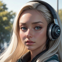 The image features a person with light-colored hair styled in bangs and a side-parting. They are wearing headphones over their ears, which appear to be connected by wires to a device not visible in the picture. The individual is dressed in what seems to be an outfit with military or tactical elements, characterized by a greenish hue and details like badges or insignia that suggest some form of authority or role associated with such attire. The background is nondescript, likely intended to focus the viewer's attention on the person. The lighting in the image casts soft shadows and highlights across the features of the character, indicating a professional or conceptual nature for the photograph.