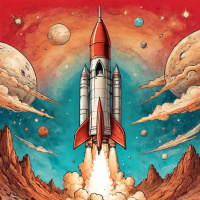 illustrative scene. At the center is a red rocket launching into space amidst a backdrop of a starry