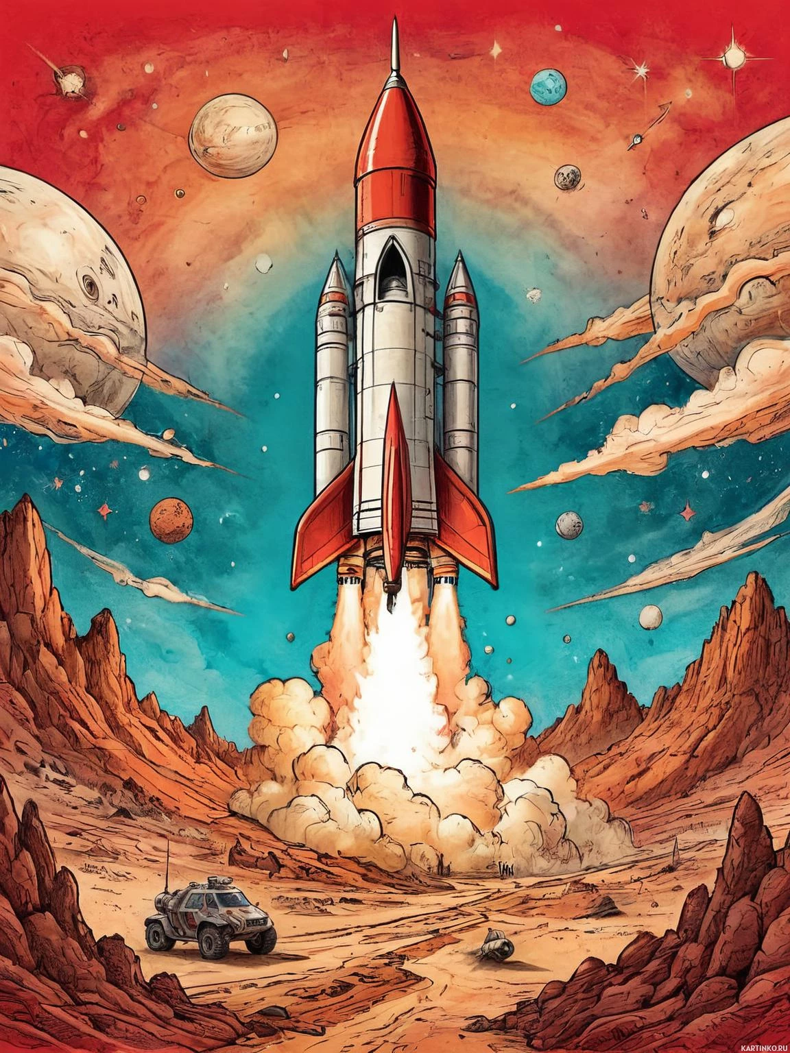 road vehicle parked at the base of the launch site, possibly serving as ground support for the rocket operation. The overall composition conveys themes of exploration,