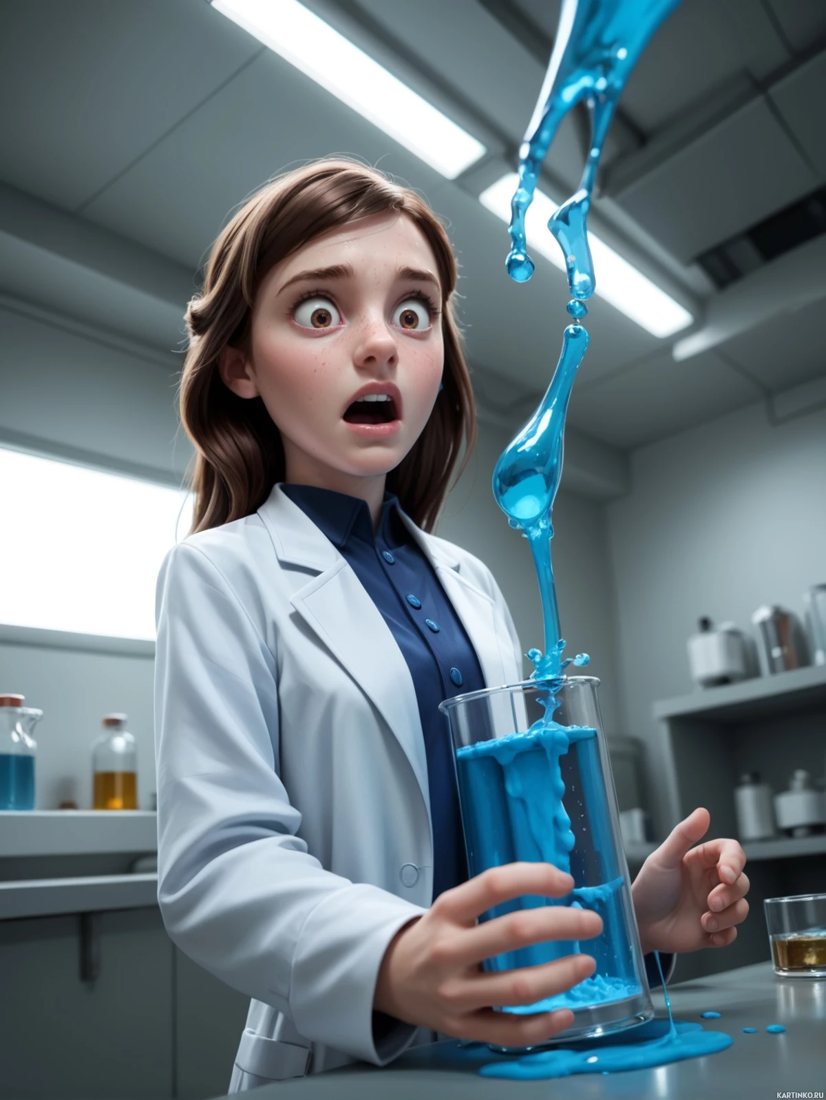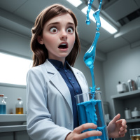 На картинке запечатлена молодая девочка с широко открытым ртом, выражающим удивление или восторг. Она наклонилась над чем-то, из чего выливается синяя жидкость. Жидкость разбрызгалась на поверхность, создавая оживлённую и немного неряшливую сцену. Судя по окружению, где видны колбы и мензурки, девочка находится в помещении, возможно, в лаборатории или мастерской. Она одета небрежно, с лёгким оттенком на губах и ногтях. По выражению лица видно, что произошло что-то неожиданное во время того, чем она занимается.