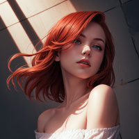 This image depicts a woman with red hair, leaning against a wooden wall. She is wearing a light-colored, off-the-shoulder dress and has a neutral expression on her face. The sunlight appears to be shining from the upper left corner, casting a shadow on her left side, indicating that the photo was taken during the day.