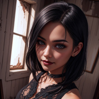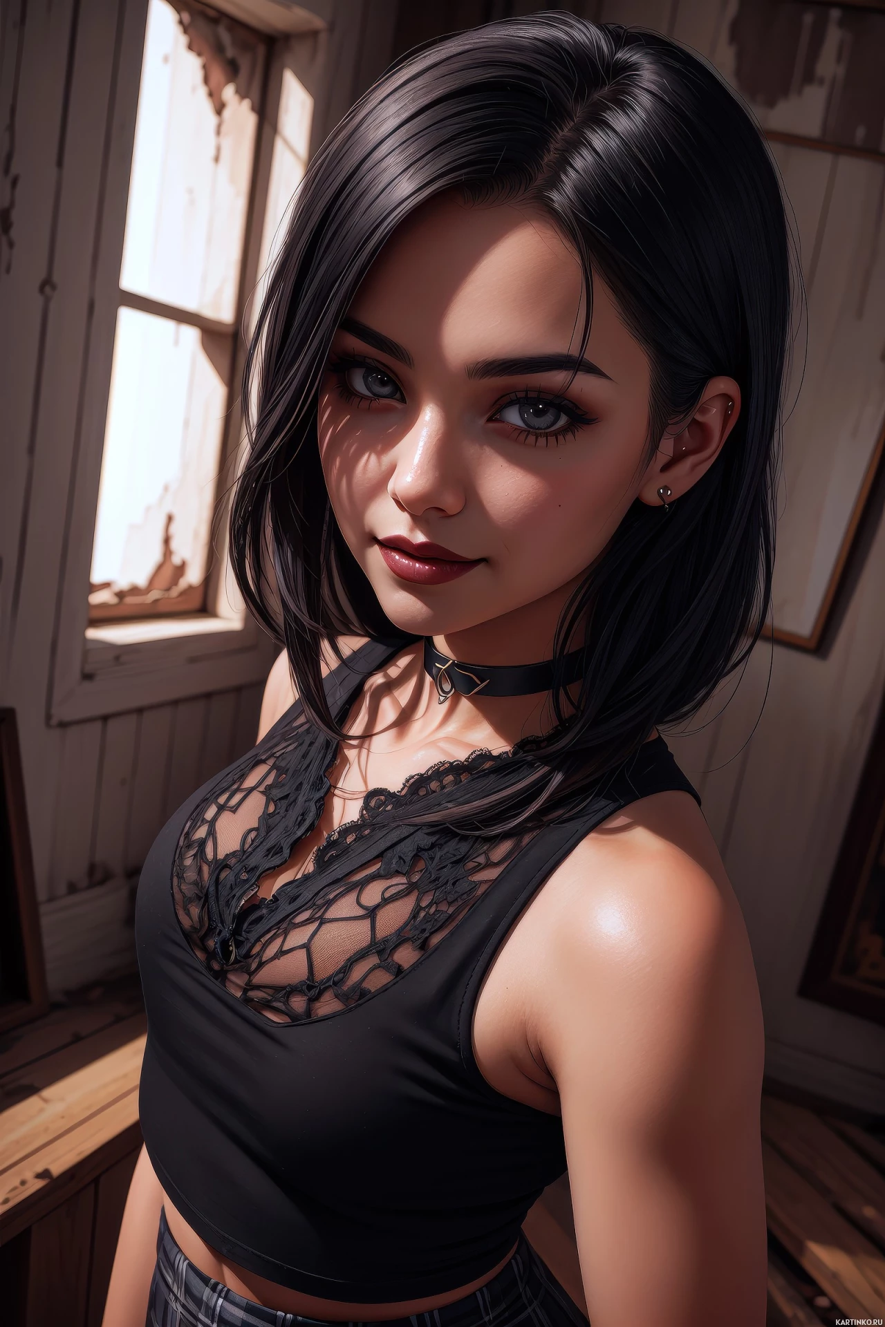 In the image, there is a person who appears to be a young adult female with short brunette hair and striking green eyes. She is wearing a black lace-up top and has her mouth slightly open as if she is speaking or about to speak. The background shows an interior space that looks aged and dilapidated, featuring peeling paint and old wooden planks on the walls.