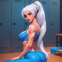 In this image, you can see a woman with white hair styled in a side-pony tail and bangs. She has a strong jawline and is wearing blue leggings that are tight-fitting. Her pose is kneeling on the ground with her hands resting on her knees, and she is looking directly at the camera with a serious expression. The setting appears to be an indoor area with lockers in the background, indicating it might be a gym or locker room.