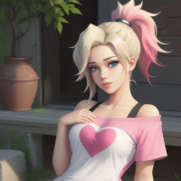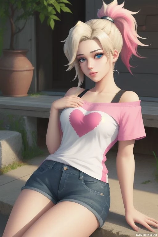 На картинке молодая девушка с розовыми волосами сидит на улице. На ней фиолетовая футболка с большим сердечком и джинсовые шорты. Ее одежда соответствует непринужденному стилю, часто встречающемуся в геймерской культуре. Позади нее – дом с серой дверью и бетонной лестницей. Место действия, похоже, жилой район, и на улице день.