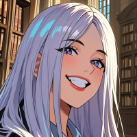 Картинка изображает молодую девушку с белыми волосами, уложенными волнистой челкой, падающей на лоб и глаза. У неё большие голубые глаза, окутанные неземной дымкой. Очень длинные ресницы добавляют её внешности легкости и сказочности. На правой щеке, чуть выше губ, у неё небольшой родинка. Выражение её лица – радость, о чём свидетельствует светлая улыбка и прикрытые глаза, дарящие ощущение счастья и умиротворения. Кожа светлая, с лёгким румянцем, что придает ей юный и здоровый вид. На ней, похоже, халат, выполненный в синих, золотых и коричневых тонах. Воротник предполагает формальную или академическую обстановку. Вокруг шеи завязана фиолетовая лента красивым бантом. На левой стороне груди виднеется какой-то знак, но детали его неразличимы под этим углом. Фон размыт из-за крупного плана и акцента на персонаже. Похоже, это внутреннее помещение с деревянной панелью или книгами, видимыми в верхней части картинки. Общий стиль изображения соответствует современной цифровой живописи, которую часто используют для анимации или видеоигр.