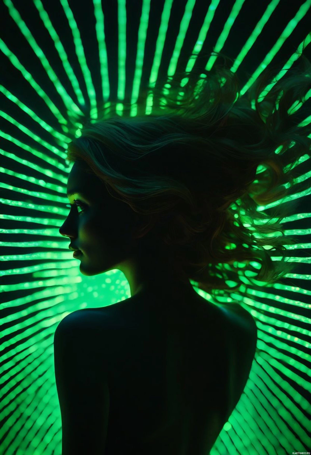 На картинке запечатлена силуэт женщины, снятый сзади, на фоне, напоминающем ночное звездное небо с мерцающими зелеными точками. Ее волосы развеваются, создавая ощущение движения или ветра. У нее стройная фигура, и она выглядит так, будто отвернулась от зрителя.