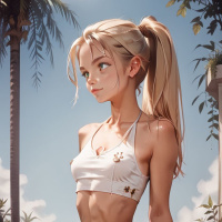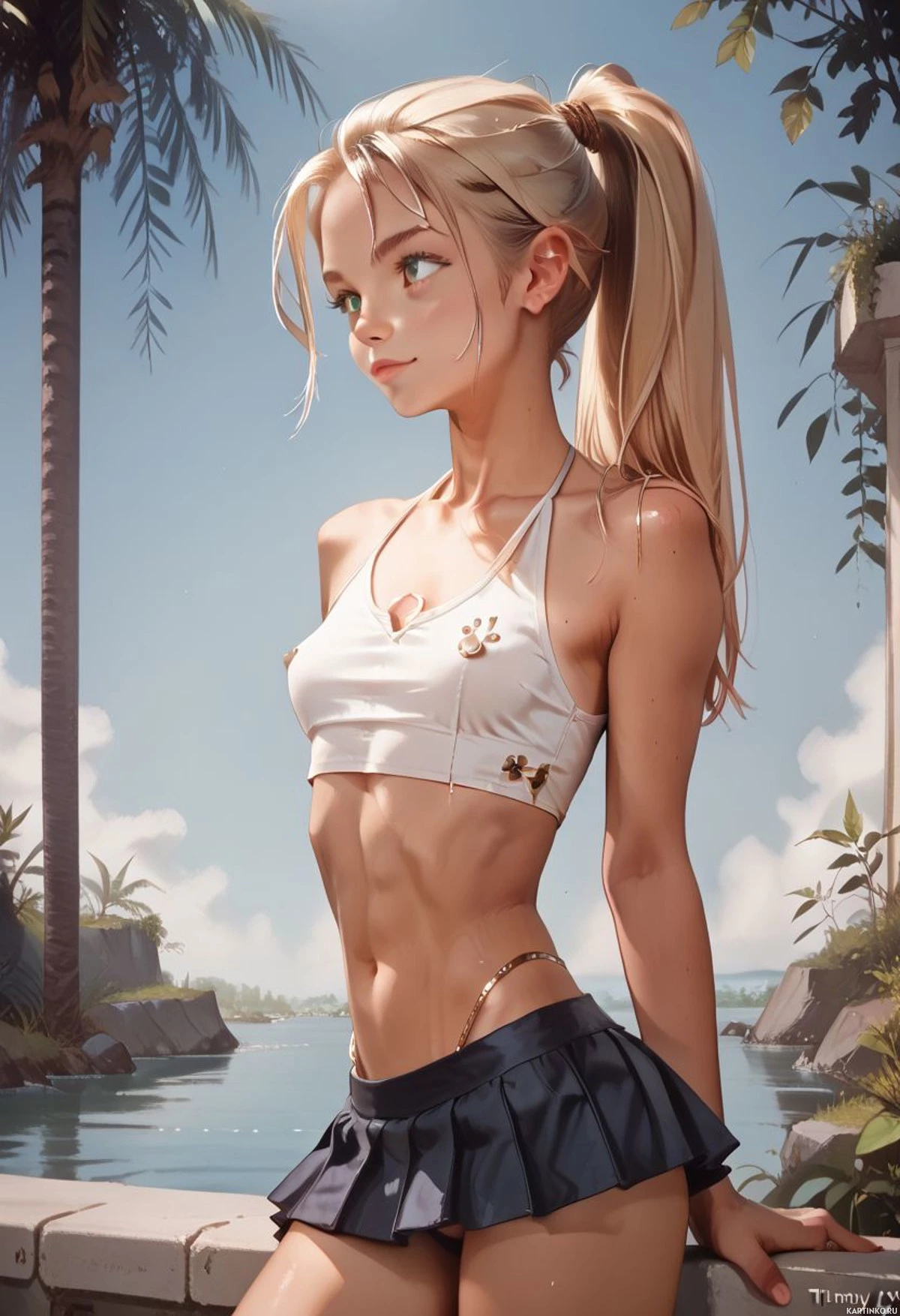 На картинке изображена девушка с короткой стрижкой, собранной в высокий пучок, в топе на бретельках и короткой юбкой. Она сидит на видном месте, возможно, на краю скалы или платформы, с видом на тропический пейзаж: пальмы, чистое небо и спокойная вода. Стиль картинки предполагает, что это цифровая иллюстрация или сгенерированное произведение искусства, а не фотография реального человека в этом месте.