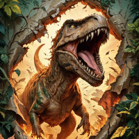 green foliage, rocks, and what looks like a cave or opening behind the T-Rex, suggesting a natural, prehistoric setting. The image is vibrant with