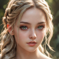 На картинке изображена молодая женщина со светлой кожей и светлыми волосами, заплетенными в косы по бокам, а челка зачесана набок. Ее взгляд направлен немного в сторону, выражение лица нейтральное. На ней макияж с четко очерченными бровями и яркими губами с легким красноватым оттенком. Фон размыт, что говорит о том, что она находится на природе, среди зелени.