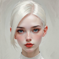 На картинке изображена женщина с белыми волосами. У нее светлая кожа и голубые глаза. Полные губы, макияж подчеркивает глаза и скулы. Выражение лица нейтральное, взгляд мягкий, направлен в камеру. Волосы уложены так, что падают на одно плечо. На ней белая блуза с высоким воротником и текстурной отделкой. Картинка выполнена в стиле гиперреалистичного портрета с акцентом на детальной прорисовке теней и текстур, что придает ей почти скульптурный вид.