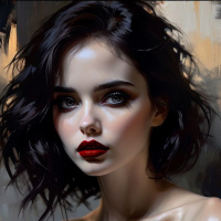 На картинке запечатлена молодая женщина с короткой темной стрижкой и светлой кожей. У нее яркий макияж, с выразительными красными губами, придающими ей чувственность. Её взгляд направлен прямо в камеру, в нем читается легкая серьезность. На ней черное кружевное белье. На заднем плане видна старая деревянная дверь с облупившейся краской, что добавляет фотографии атмосферу потертости и винтажности.