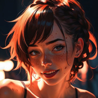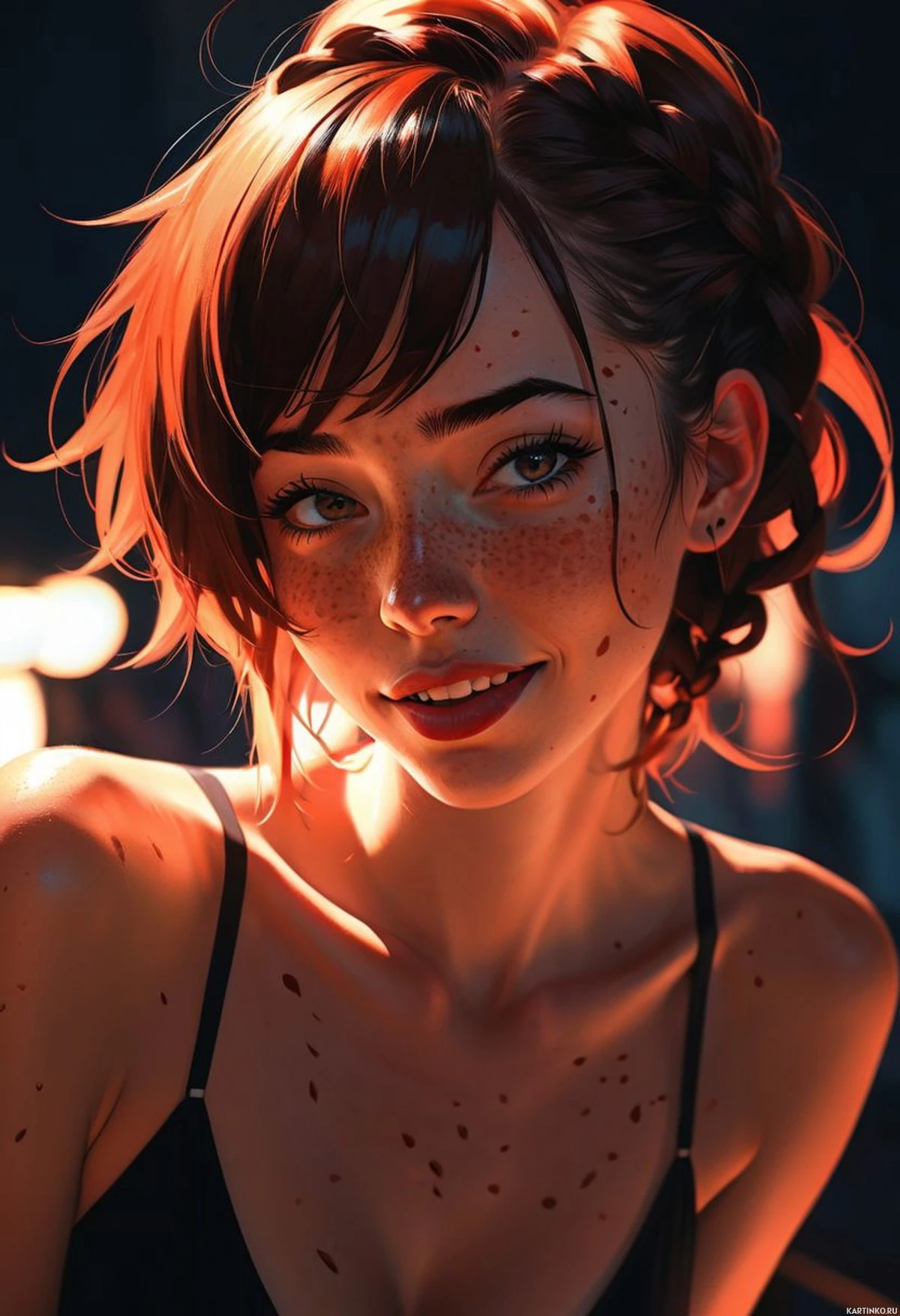 The image depicts a young woman with short brown hair, wearing what appears to be a red lighting effect that highlights her face and upper chest area. She is smiling gently and looking directly at the viewer. Her skin tone has a warm undertone, and she is adorned with what seems to be a minimal makeup look, emphasizing her natural features. She is dressed in a black top with thin straps or garters, revealing some cleavage. The background suggests an indoor setting with a dim ambiance, possibly a room with red lights that match the lighting on her face.