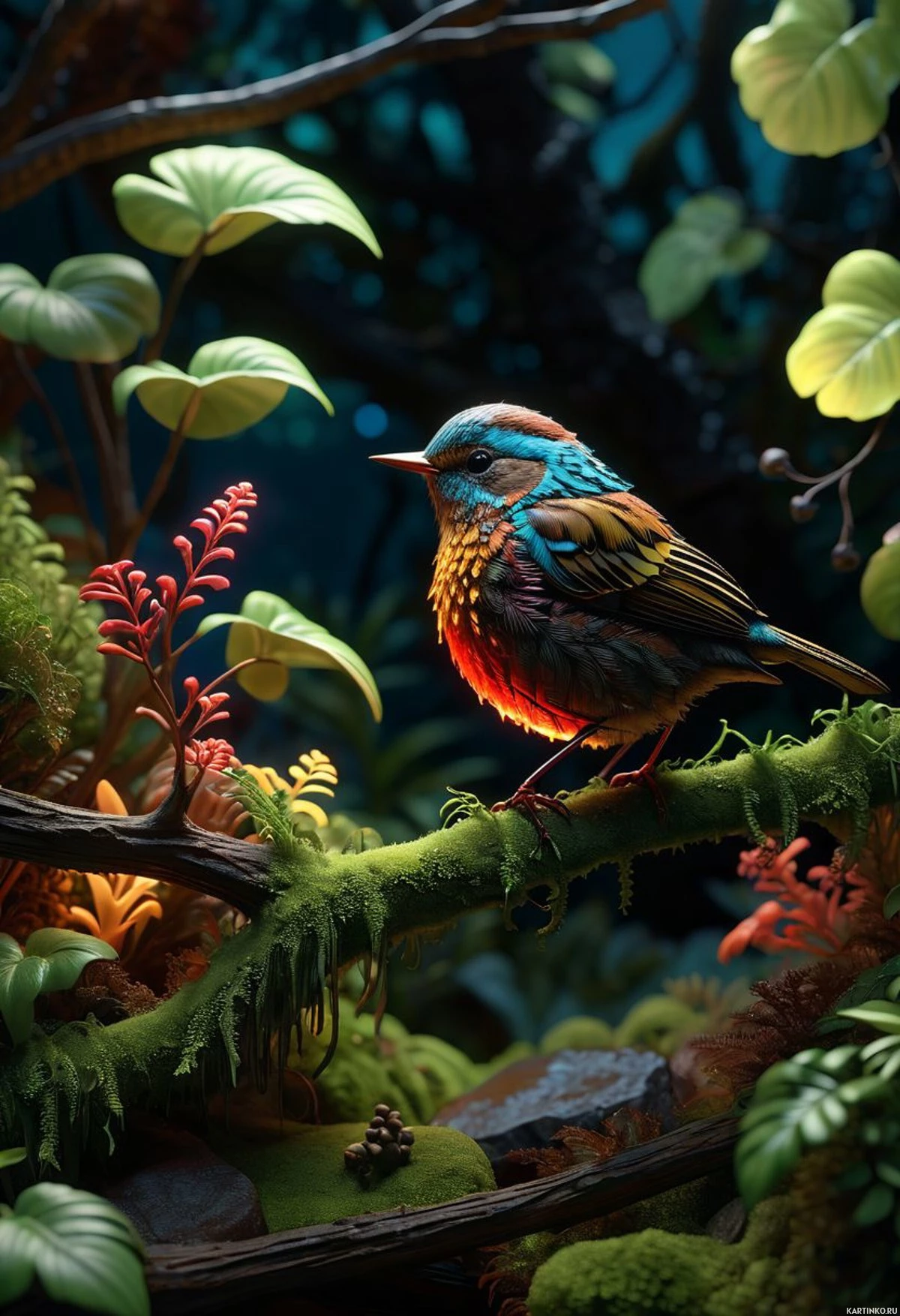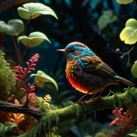 shades of green from leaves to moss, suggesting a lush and healthy ecosystem. The lighting suggests either dusk or dawn, with a gradient of colors ranging from warm