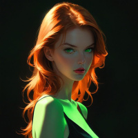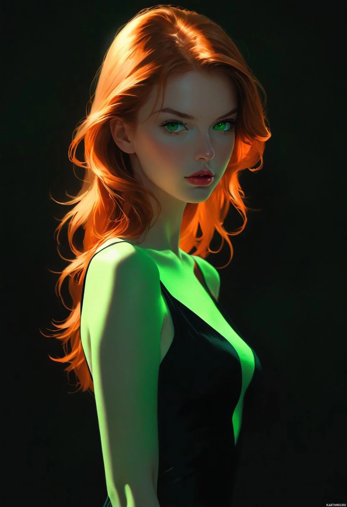 На картинке — трехмерная визуализация женского персонажа с рыжими волосами и зелеными глазами. У девушки стройная фигура, она одета в черное платье без рукавов, подчеркивающее ее торс и плечи. Выражение лица нейтральное, и…