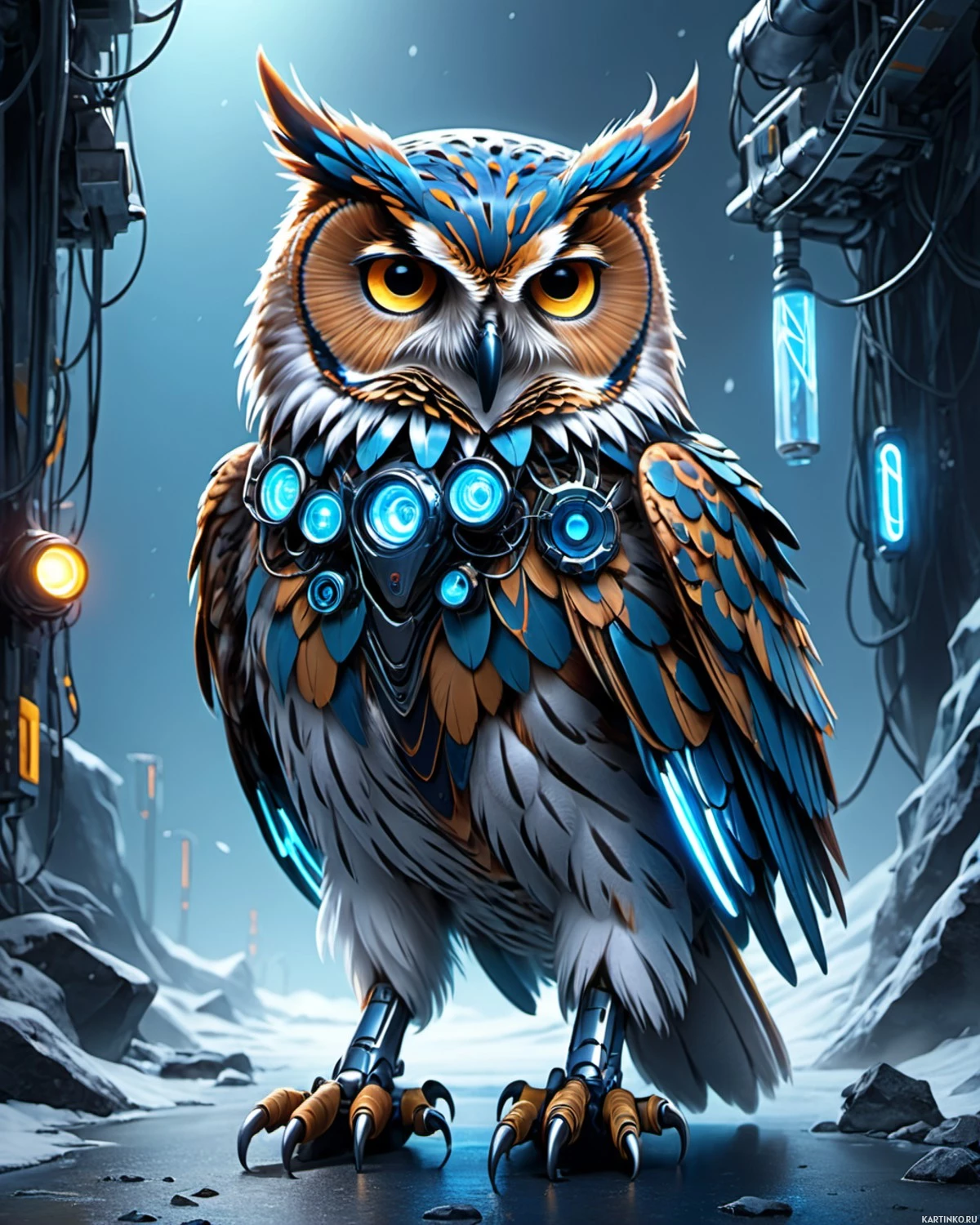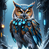 The image depicts an owl with a detailed and vibrant plumage. It has prominent features such as a large head,