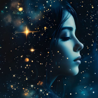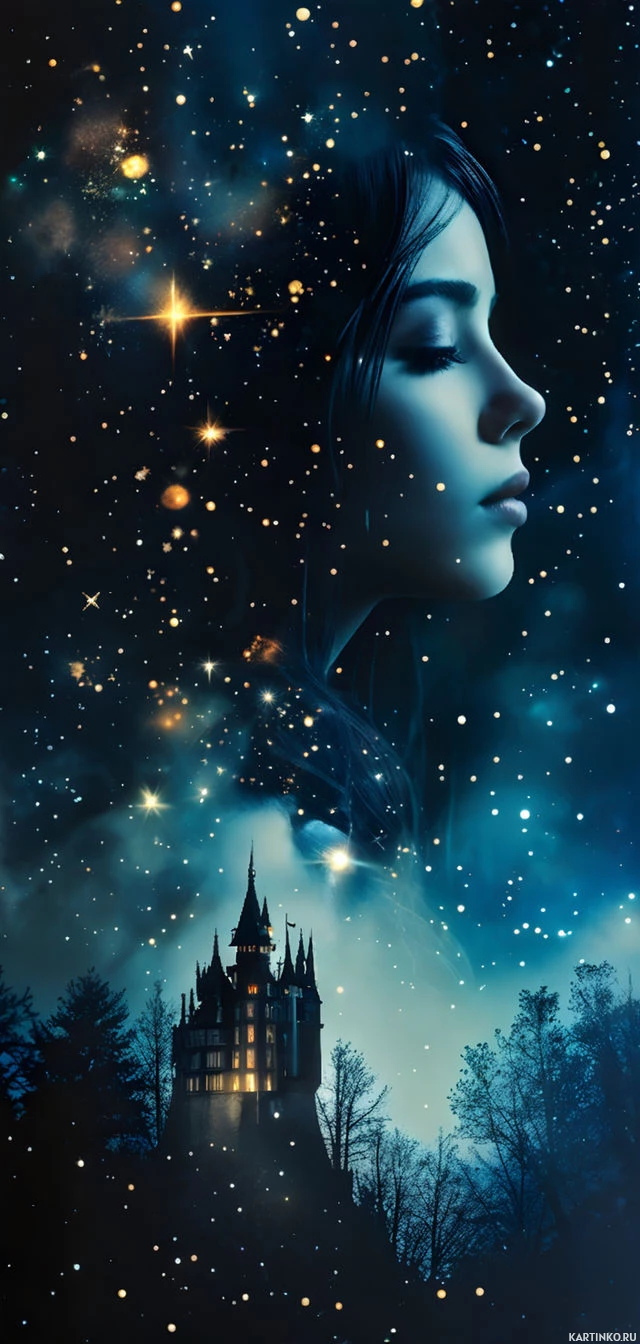 Молодая женщина с закрытыми глазами на фоне ночного неба, усыпанного звездами и освещенного вспышками молний. На переднем плане – картинка замка под полной луной.