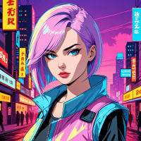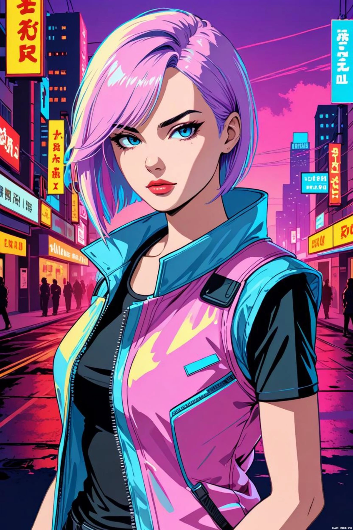 На картинке изображена девушка с розовыми волосами, уложенными в пучок и с челкой, в розово-черном наряде, включающем куртку. У нее серьезное выражение лица, а на заднем плане – городской пейзаж ночью, возможно, из видеоигры или графического романа, судя по стилизованной графике. Она стоит, положив одну руку на бедро, а другую опустив вдоль тела.