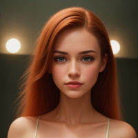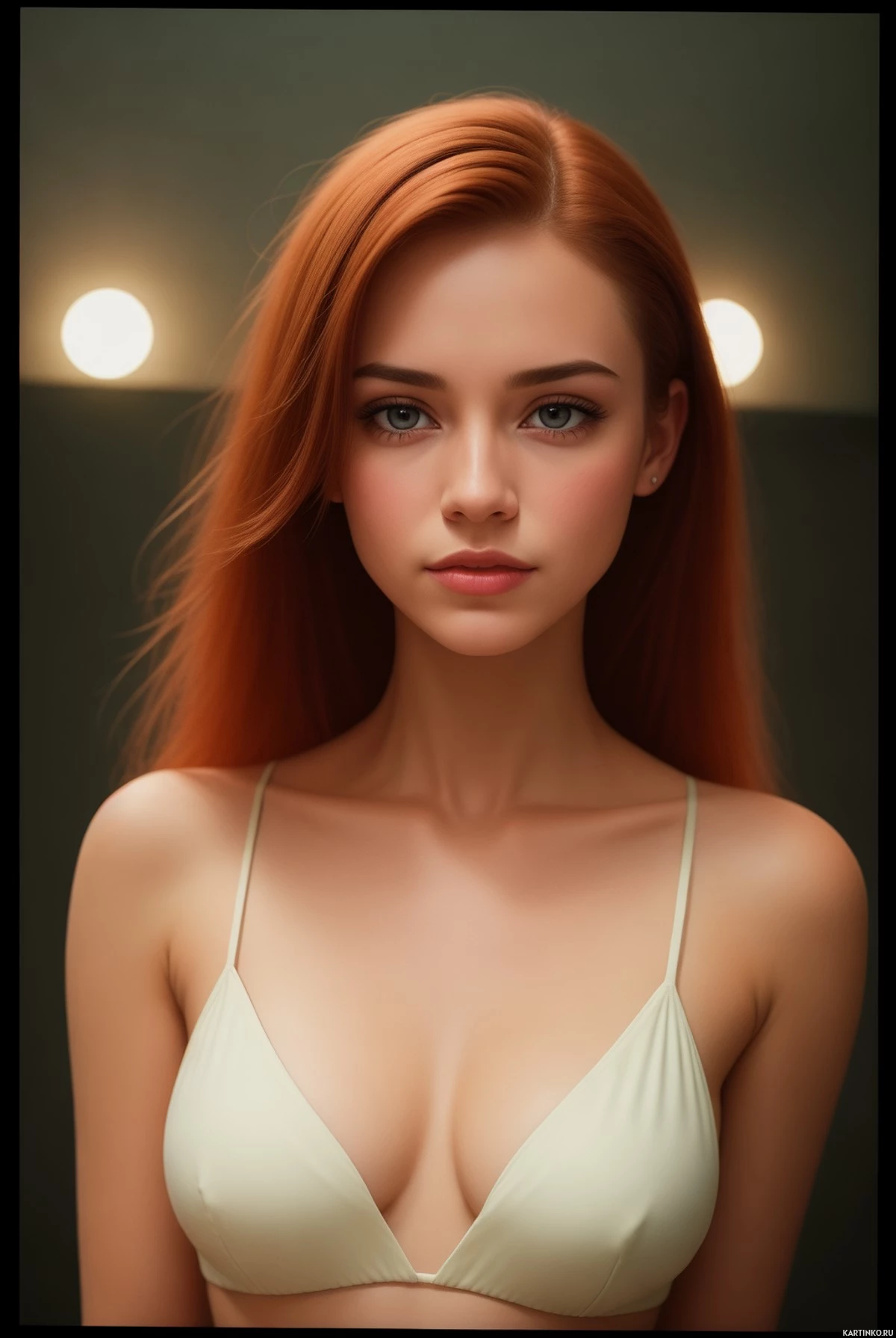 На картинке изображена женщина с рыжими волосами в светлом топе, открывающем зону декольте. У неё нейтральное выражение лица, и она смотрит прямо в камеру, устанавливая зрительный контакт. Свет в фотографии мягкий, создаёт тёплый тон на лице и верхней части тела. Фон размыт, но предполагает помещение с приглушённым освещением, возможно, клуб или пространство для мероприятий, судя по лампам, излучающим тёплый свет.