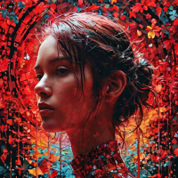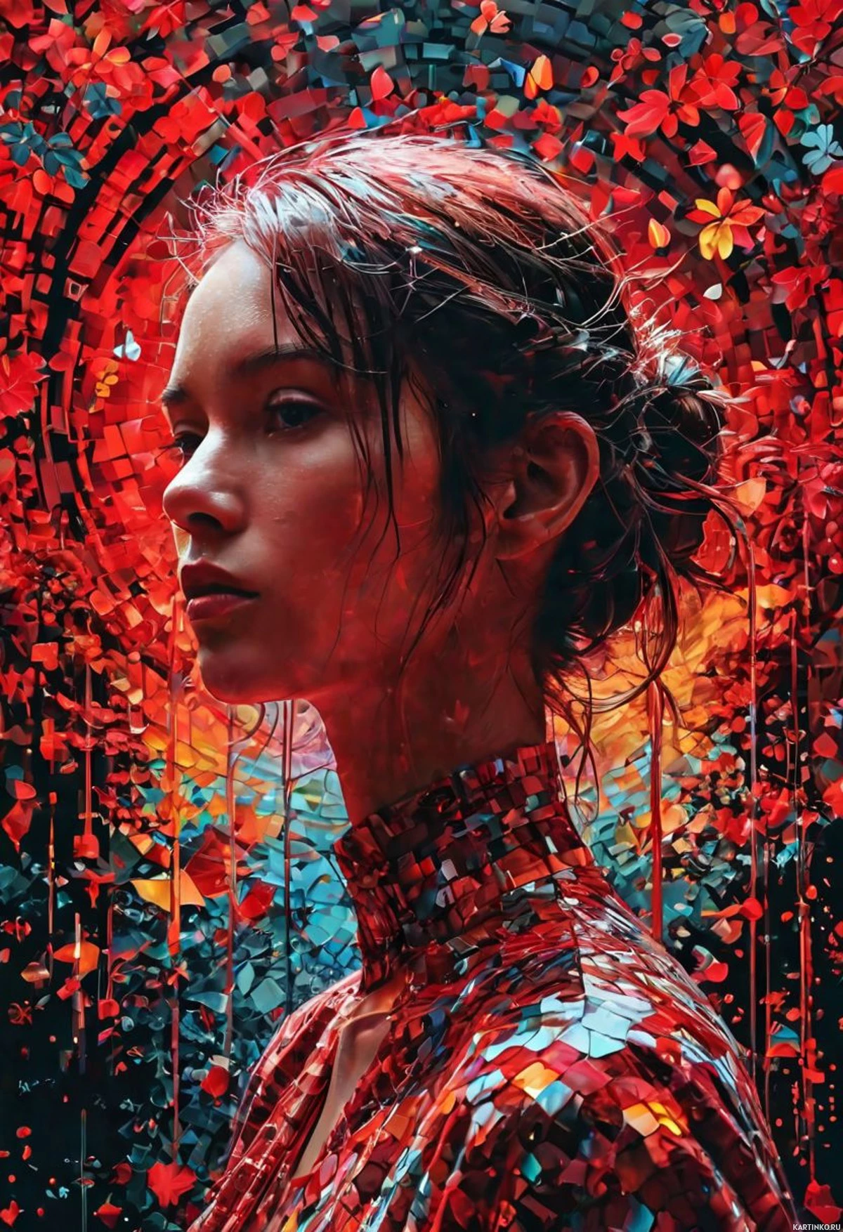 The image features a woman with dark hair styled in an updo and adorned with what appears to be cherry blossom petals, which are falling around her. She has red lipstick applied and is looking directly at the viewer with a neutral expression. Her attire includes a shimmering top that reflects light, suggesting sequins or glitter. The background consists of vivid colors and patterns that resemble a tapestry of autumn leaves in hues of orange, red, and yellow, creating an artistic backdrop that contrasts with the woman's central presence.