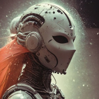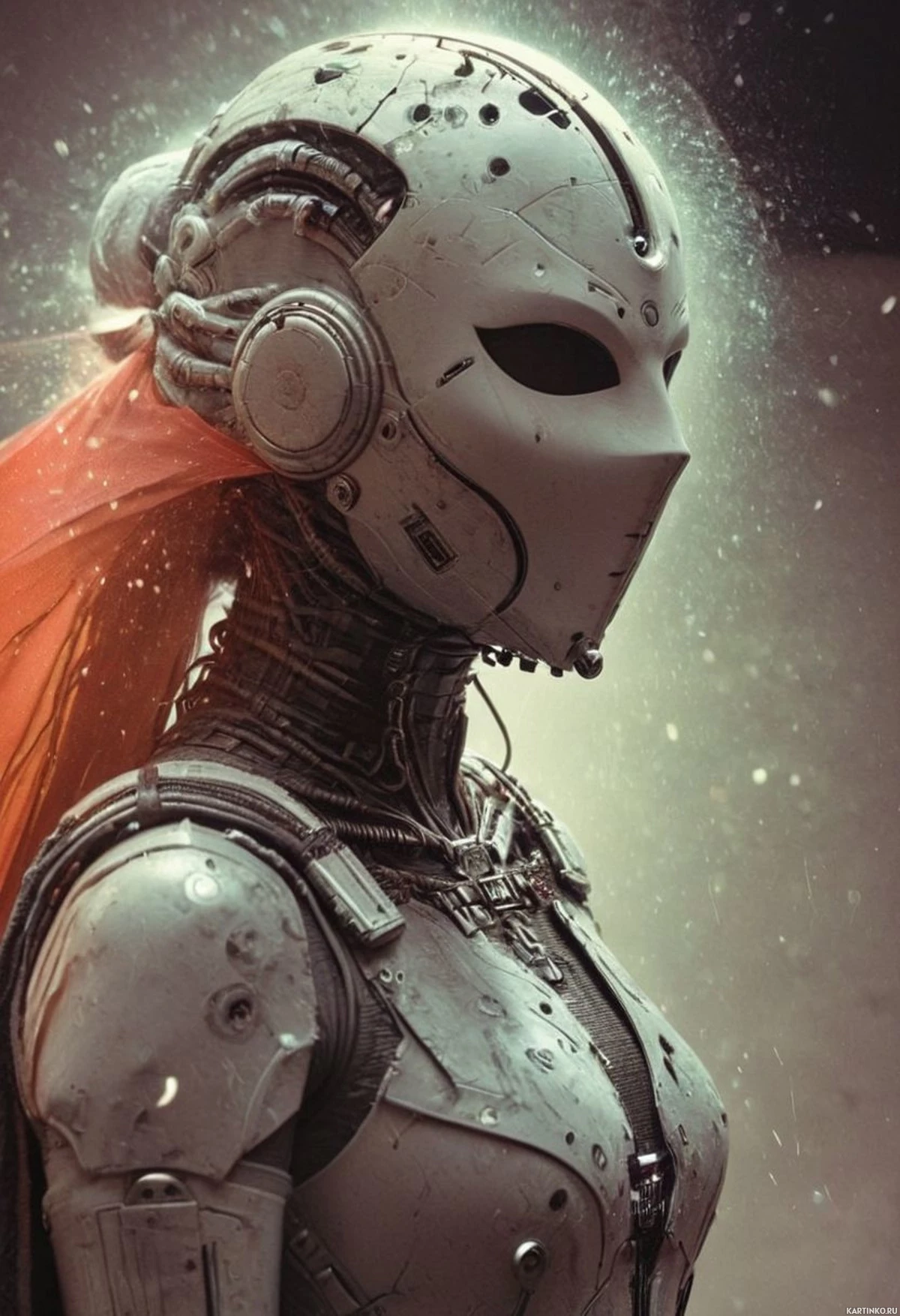 На картинке представлен гуманоидный робот сложного дизайна, сочетающий в себе элементы футуристической брони и эстетики научной фантастики. У робота голова с тем, что похоже на механическое или роботизированное лицо, намекающее на передовые технологии или кибернетические улучшения. Его тело состоит из металлических компонентов с видимыми проводами и механическими деталями, что указывает на высокую степень сложности. На плечах робота накинут красный плащ, создающий резкий контраст с металлическим обликом. Это может быть символическим или функциональным элементом – возможно, это отражает человеческое начало, интегрированное в дизайн робота, или же защитный слой в футуристическом контексте. Вокруг головы робота парят мелкие световые частицы, словно излучающиеся из его короны, придавая картинке некую эфирность или магическую ауру. Эти световые частицы также служат визуальной метафорой силы или энергии, исходящей от головы робота. Общая композиция картинки предполагает, что перед нами персонаж, который может играть ключевую роль в научно-фантастическом повествовании, где переплетаются передовые технологии и человечность в необычном сочетании.