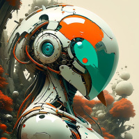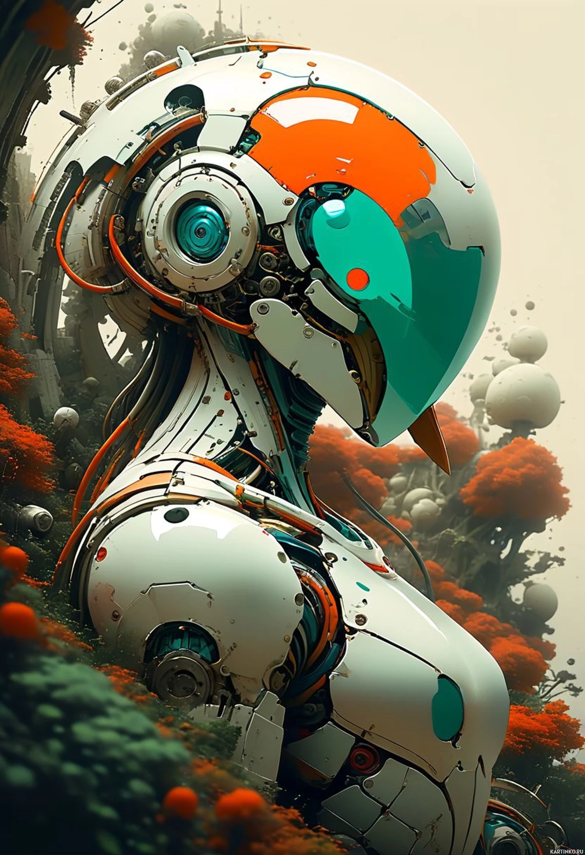 На картинке изображен робот с человеческими чертами, стоящий в, похоже, футуристической обстановке. У робота торс, напоминающий человеческое тело, с выступающей формой на груди, что намекает на женские черты. Его голова скрыта под защитным шлемом с визором, что подчеркивает его механическую природу. На плече робота расположены несколько голографических дисплеев, которые могут быть интерфейсами для коммуникации или сбора данных. Робот стоит на фоне пышной зелени, а на заднем плане виден необычный цветок с ярко-красными лепестками, контрастирующий с общим стерильным видом окружения. Общий стиль картинки отсылает к научной фантастике, характеризующейся передовыми технологиями и фантазийным изображением будущей брони.