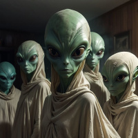 The image depicts a group of aliens standing in an indoor setting with dim lighting, creating a somewhat eerie atmosphere. In the foreground is an alien dressed in robes that are reminiscent of traditional burial garments, with the face hidden within the hood's shadows. The central figure, who appears to be the leader or focus of attention, stands out among the others due to its attire, which includes a more ornate headdress and garment, suggesting a higher status or role within this group. The other aliens are also clad in long robes that drape over their bodies, with hoods obscuring their faces. The color palette is muted, using earth tones that blend with the dim lighting, enhancing the sense of mystery and otherworldliness associated with science fiction depictions of aliens. The style of the image is reminiscent of a still from a science fiction film or television show, characterized by its dramatic composition and the use of light and shadow to create an ominous mood.