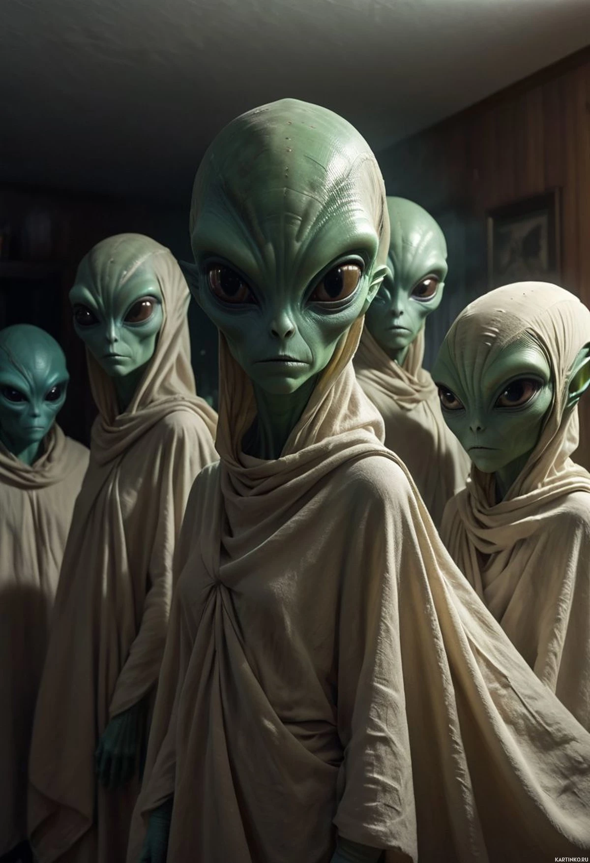 На картинке запечатлена группа инопланетян, стоящих в помещении, освещенном приглушенным светом, что создает слегка жуткую атмосферу. На переднем плане — инопланетянин в балахоне, напоминающей традиционные погребальные одежды, с лицом, скрытым в тени капюшона. Центральная фигура, по-видимому, лидер или главный объект внимания, выделяется среди остальных благодаря одежде: на нем более богато украшенный головной убор и накидка, что указывает на высокий статус или роль в этой группе. Остальные инопланетяне также одеты в длинные балахоны, ниспадающие на их тела, и капюшоны скрывают их лица. Цветовая гамма приглушена, преобладают землистые тона, гармонирующие с тусклым освещением, усиливая ощущение тайны и инопланетности, свойственное научно-фантастическим изображениям инопланетян. Стиль картинки напоминает кадр из научно-фантастического фильма или телешоу, характеризующийся драматической композицией и использованием света и тени для создания мрачного настроения.
