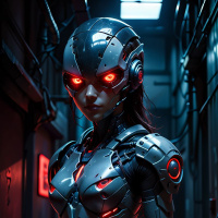 На картинке изображен гуманоидный робот в футуристической броне, стоящий в промышленной обстановке. Робот преимущественно серебристый и черный, с красными светящимися глазами, придающими ему угрожающий вид. Он стоит прямо, слегка повернув голову к зрителю, что говорит об настороженности или любопытстве. На заднем плане видны механизмы и трубы, создающие индустриальную атмосферу. Дизайн робота указывает на передовые технологии, вероятно, из научно-фантастического мира.