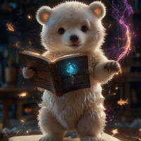 small paws are delicately placed on the book, suggesting curiosity and fascination for what might be within its pages. The background of the image reveals an ambiance of magic and wonder. A purple light seems to emanate from the bear itself, illuminating the scene with