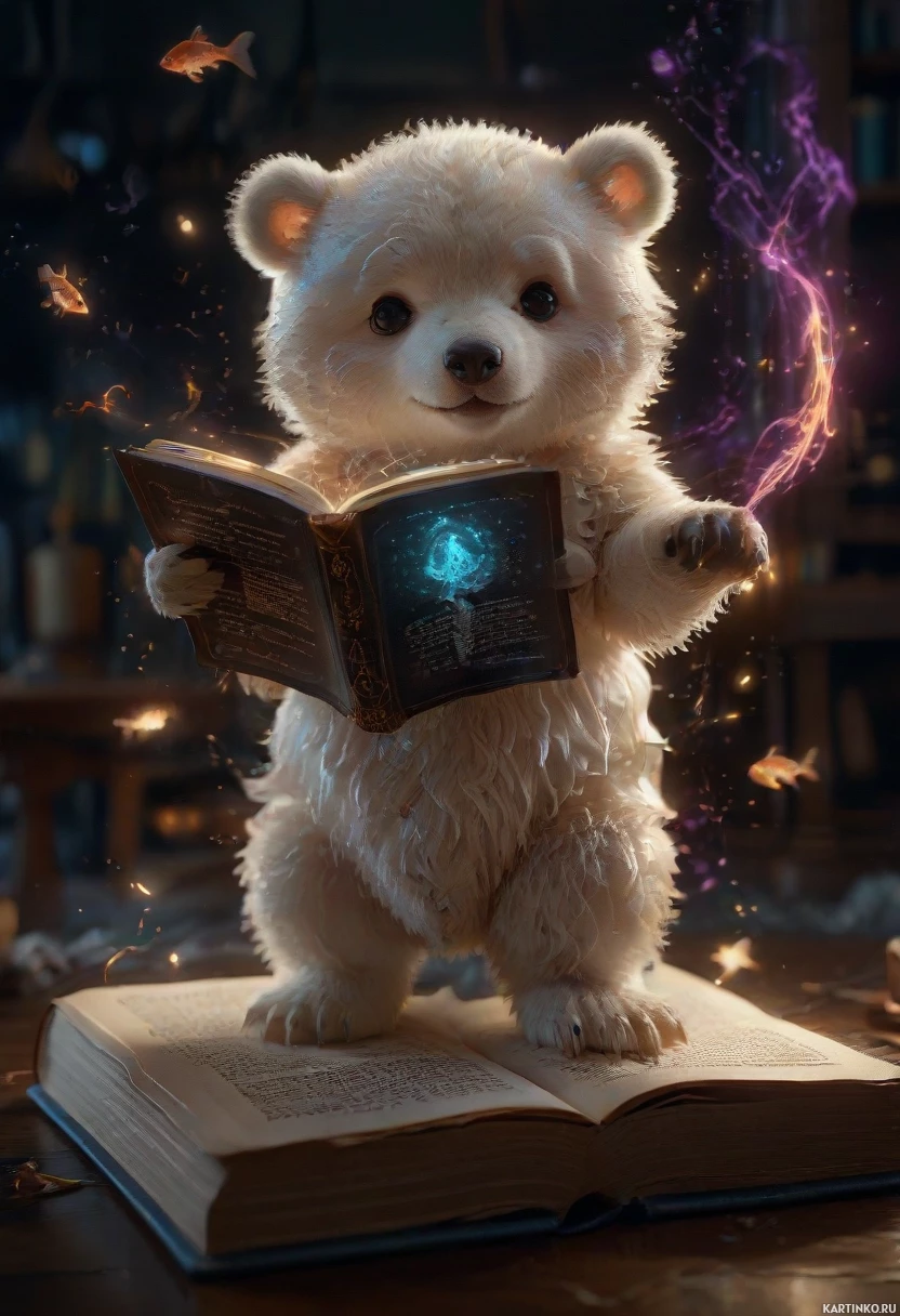 small fish, possibly floating in mid-air, adding an enchanting element to the image. The bear is depicted looking attentively at the book, its eyes filled with interest and focus. Its ears are perked up, further indicating that it is listening or ready to engage with whatever story the book contains. The overall composition of the image suggests a theme of learning, imagination, and magical discovery.