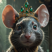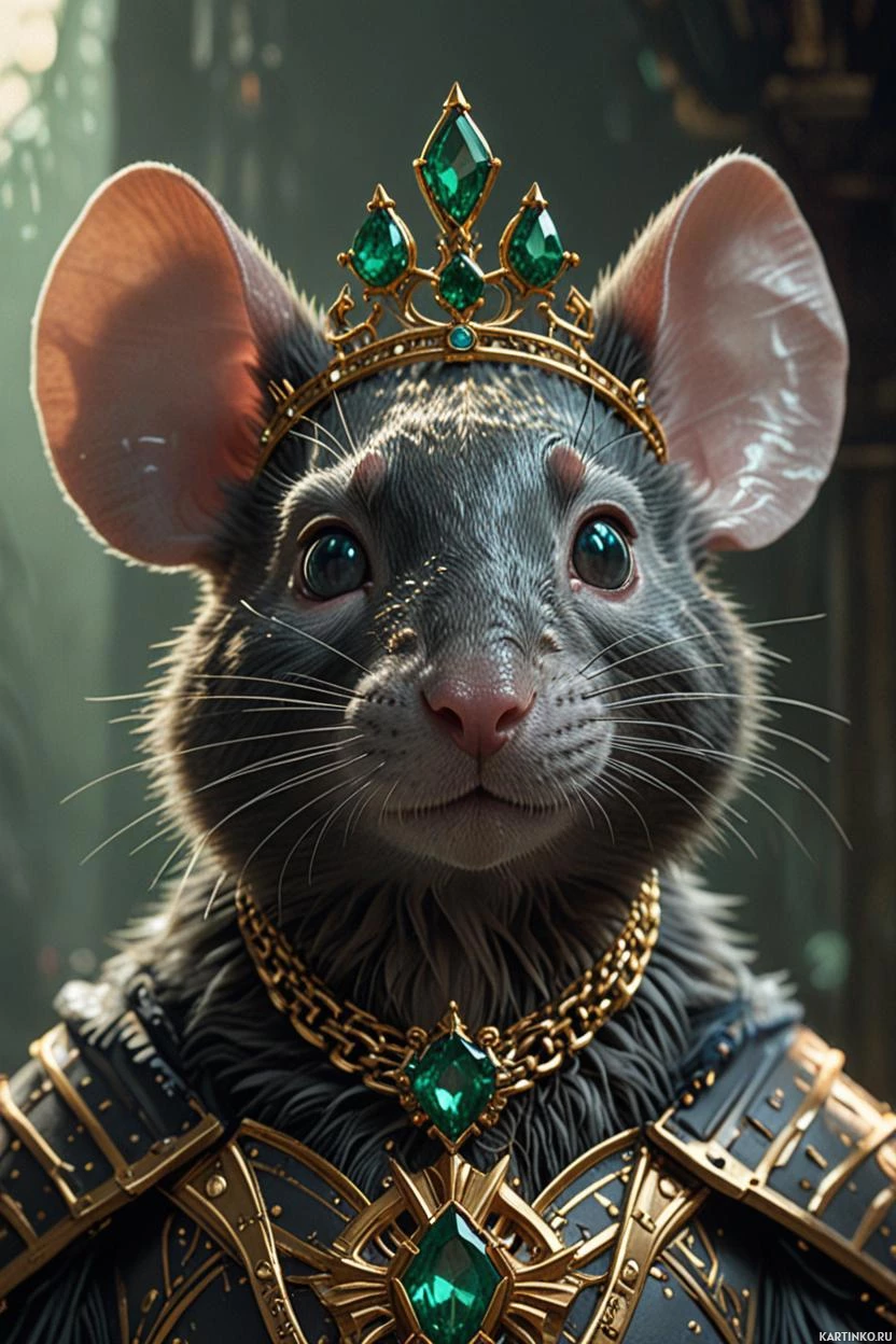На картинке — стилизованная иллюстрация зверька, похожего на крысу, антропоморфного, с человеческой одеждой и доспехами. На голове у него виднеется корона, а тело украшено разнообразными декоративными аксессуарами, такими как драгоценности и элементы брони. Выражение морды крысы сосредоточенное и бдительное, и кажется, что он стоит прямо, что добавляет в работу элементы фэнтези или влияние ролевой игры.