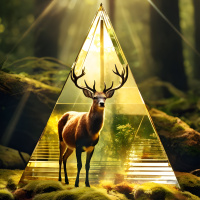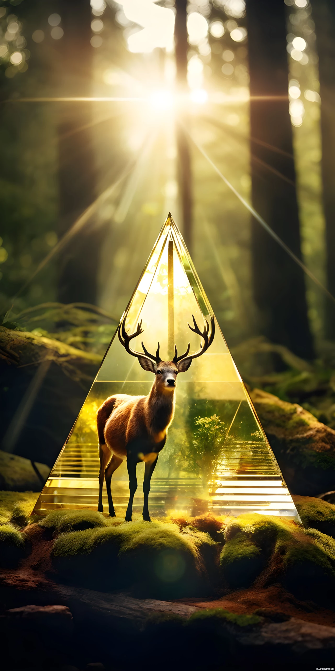 На картинке изобрана безмятежная лесная сцена, в центре которой олень. Он стоит на земле, окруженный густой и сочной листвой деревьев. Над оленем сияет солнце, заливающее всю сцену светом. Справа от картинки можно заметить необычную елку, сложенную из трех треугольных элементов, расположенных в форме треугольника. Левый треугольник находится на земле, а два других образуют цельный треугольник, уходящий в небо. Создается впечатление, что свет солнца исходит изнутри этой искусственной конструкции.