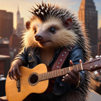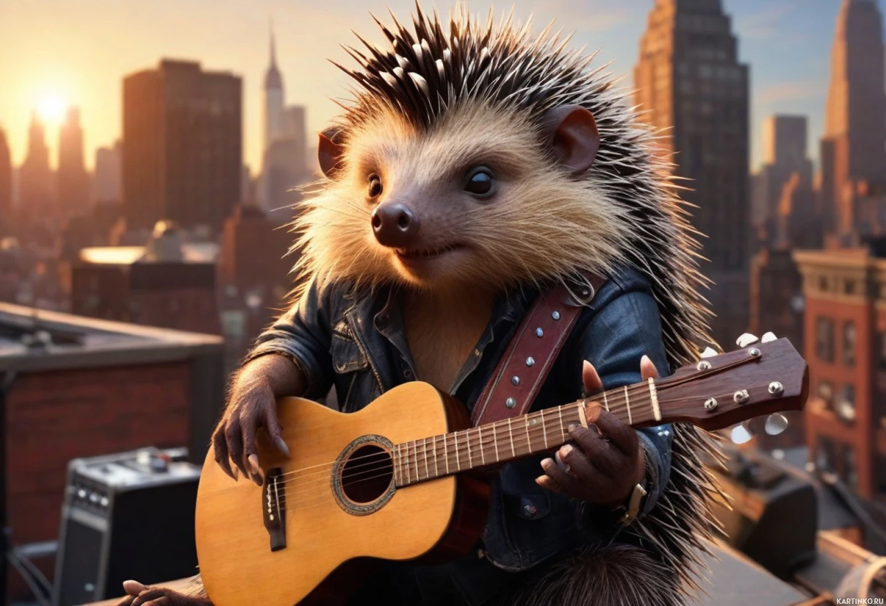 На картинке ежик в джинсах играет на гитаре в городском пейзаже. У него на спине и хвосте иголки, а на мордочке – человеческое выражение. На заднем плане виднеется кирпичная застройка и силуэт небоскребов Нью-Йорка на закате, освещенных оранжевыми красками вечера.