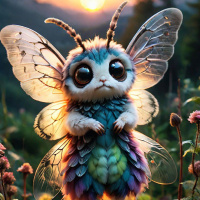 The image portrays an anthropomorphic creature that resembles a fox. This creature has large, transparent wings, a prominent tail, and is standing upright on two legs. It has a whimsical expression, with its ears perked up and eyes wide open as if it's looking at something in the distance. The background suggests a tranquil forest setting with trees under an evening sky where the sun is partially visible behind a range of mountains. The creature stands amidst various plants and flowers, including pink and purple flowers.