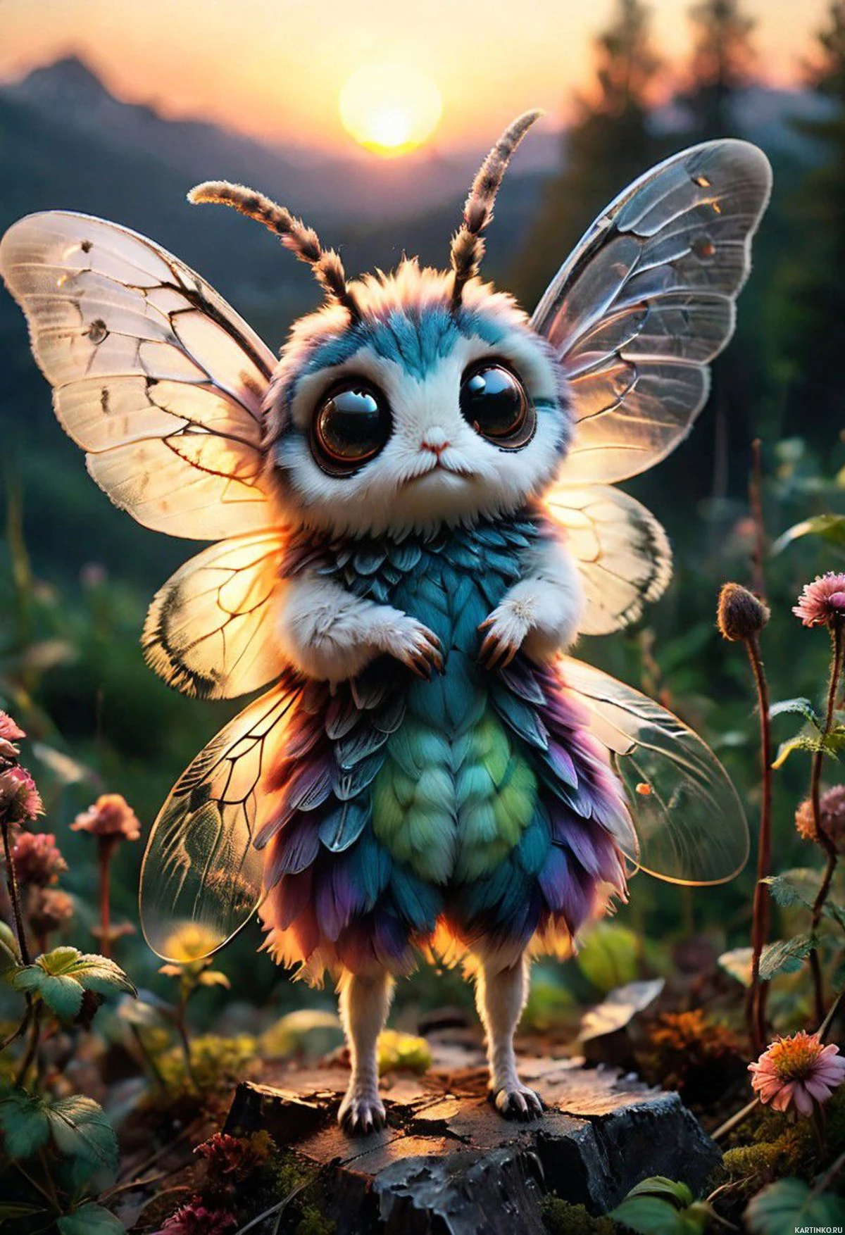На картинке изображено существо, похожее на лису, но антропоморфное. У него большие, прозрачные крылья, пушистый хвост, и оно стоит на двух ногах. Выражение его мордочки – игривое, ушки на макушке, глаза широко распахнуты, будто оно смотрит вдаль. На заднем плане – спокойный лесной пейзаж с деревьями на фоне вечернего неба, где сквозь горы виден отблеск заходящего солнца. Существо стоит среди разнообразных растений и цветов, среди которых розовые и фиолетовые.