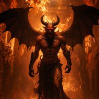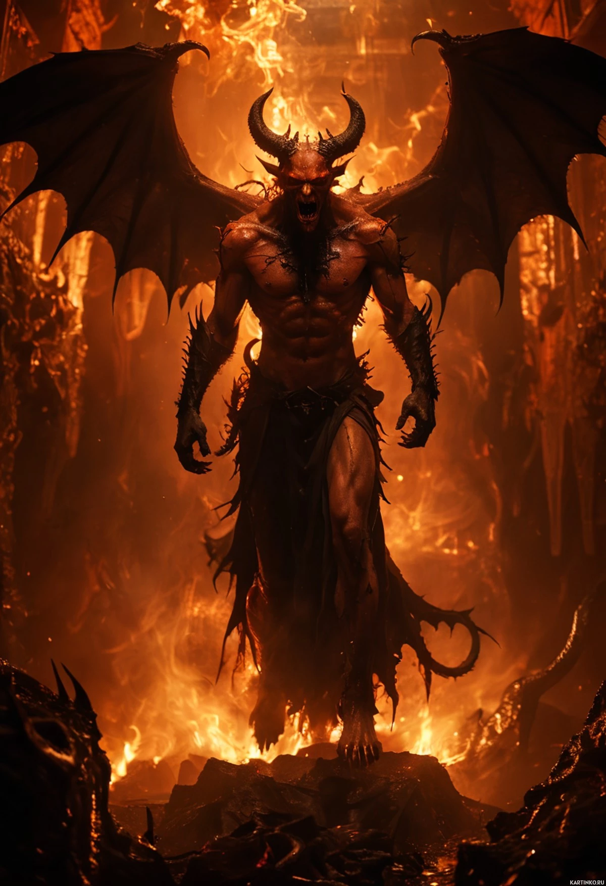 Могущественный демон стоит на фоне огненной бездны, окруженный пламенем и дымом, излучая мощную энергию. У него рога, темная кожа, острые зубы, и на нём доспехи, сделанные из частей тела животных, с красным плащом, наброшенным на плечи.