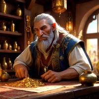 The image depicts a fantasy scene with a character that appears to be a dwarf, given the traditional attire and setting commonly associated with dwarves in mythology and fantasy stories. This character is standing at what looks like an alchemist's or enchanter's workbench, as suggested by the array of various bottles and jars with labels that are not clearly readable, indicating a collection of potions or ingredients. The dwarf is engaged in some sort of activity involving a cloth with designs on it spread out before him, and he appears to be working with items such as coins and possibly gemstones. The character has a long white beard, suggesting an older age, and is dressed in what looks like historical or fantasy-themed clothing with intricate details, including a cape and a hat that could imply a status of importance or wealth within his context. The setting is indoors, with natural light filtering through a window archway to the left side of the image, casting shadows and illuminating the room in a warm tone. The art style is realistic with attention to detail, particularly in the textures and materials visible, like the wood grain of the furniture and the metallic sheen on some of the jars.