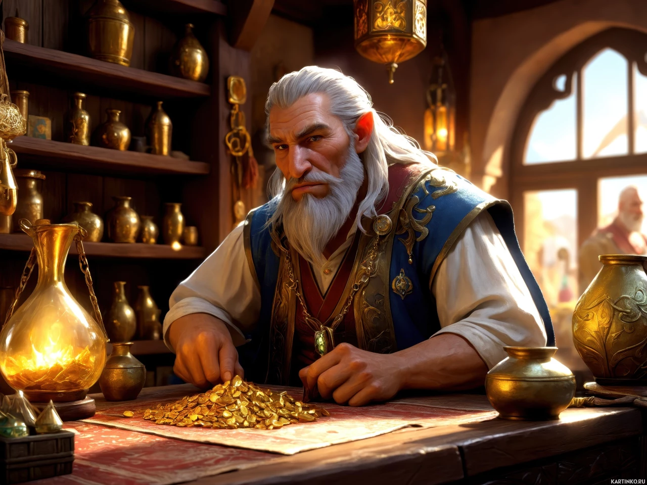 Картинка изображает фантастическую сцену с персонажем, похожим на гнома, судя по традиционной одежде и окружению, часто встречающимся в мифологии и фэнтезийных историях. Гном стоит у верстака алхимика или чародея, что видно по множеству бутылок и банок с неразборчивыми этикетками, указывающими на коллекцию зелий или ингредиентов. Гном занят чем-то, связанным с тканью с узорами, расстеленной перед ним, и работает с монетами и, возможно, драгоценными камнями. У персонажа длинная белая борода, что говорит о его возрасте, и он одет в историческую или фэнтезийную одежду с замысловатыми деталями, включая плащ и шляпу, которые могут указывать на его статус или богатство. Действие происходит в помещении, естественный свет проникает через арочную оконную раму слева, отбрасывая тени и освещая комнату в теплых тонах. Стиль рисунка реалистичный, с вниманием к деталям, особенно к текстурам и материалам, таким как текстура древесины мебели и металлический блеск на некоторых банках.