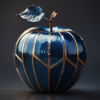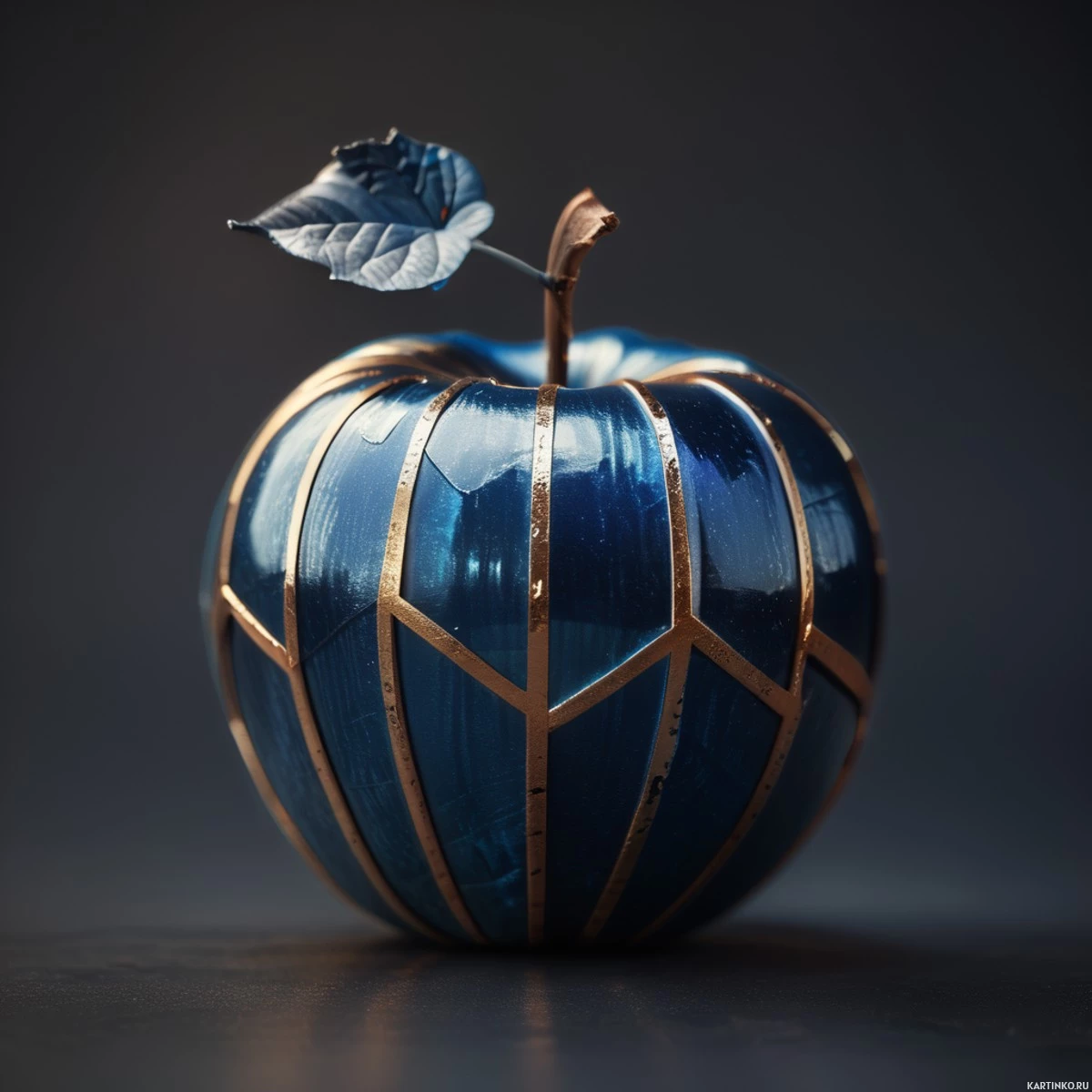 На картинке изображён один синий яблоко с золотистым стеблем и листом. Оно имеет глянцевую поверхность и украшено нежным, мерцающим синим орнаментом, напоминающим сложный плетеной узор, опоясывающий его окружность. Фон тёмный и размытый, что подчеркивает яблоко как главный объект внимания на картинке.