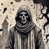 The image depicts an illustration of a figure that appears to be a skeletal representation, reminiscent of the Grim Reaper, wearing robes and holding a scythe. The figure has dark skin, which could suggest a representation of death or a similar entity in various cultural mythologies. The figure is standing in what seems to be an ominous setting with gothic architecture, possibly resembling a castle, indicated by the presence of arches and spires in the background. There are splatters that look like dark stains on the walls and ground, contributing to the grim atmosphere. The figure is looking downward with its hands clasped together, as if in contemplation or awaiting the arrival of someone.