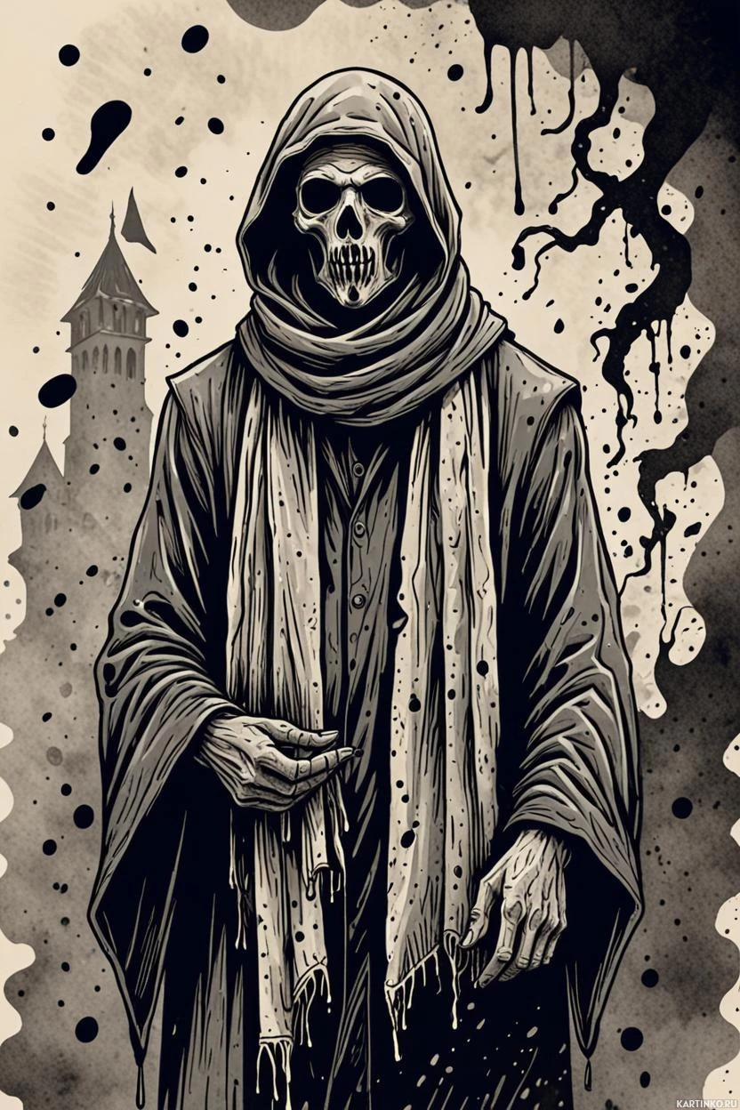 На картинке изображена иллюстрация фигуры, напоминающей Смерть, в одеяниях и с косой. У фигуры тёмная кожа, что может указывать на воплощение смерти или подобного существа в различных культурных мифах. Она стоит на фоне зловещей обстановки с готической архитектурой, возможно, это замок, что подтверждается арками и шпилями на заднем плане. На стенах и земле видны тёмные пятна, усиливающие мрачную атмосферу. Фигура опустила голову и сцепила руки, словно погружена в раздумья или ждёт кого-то.