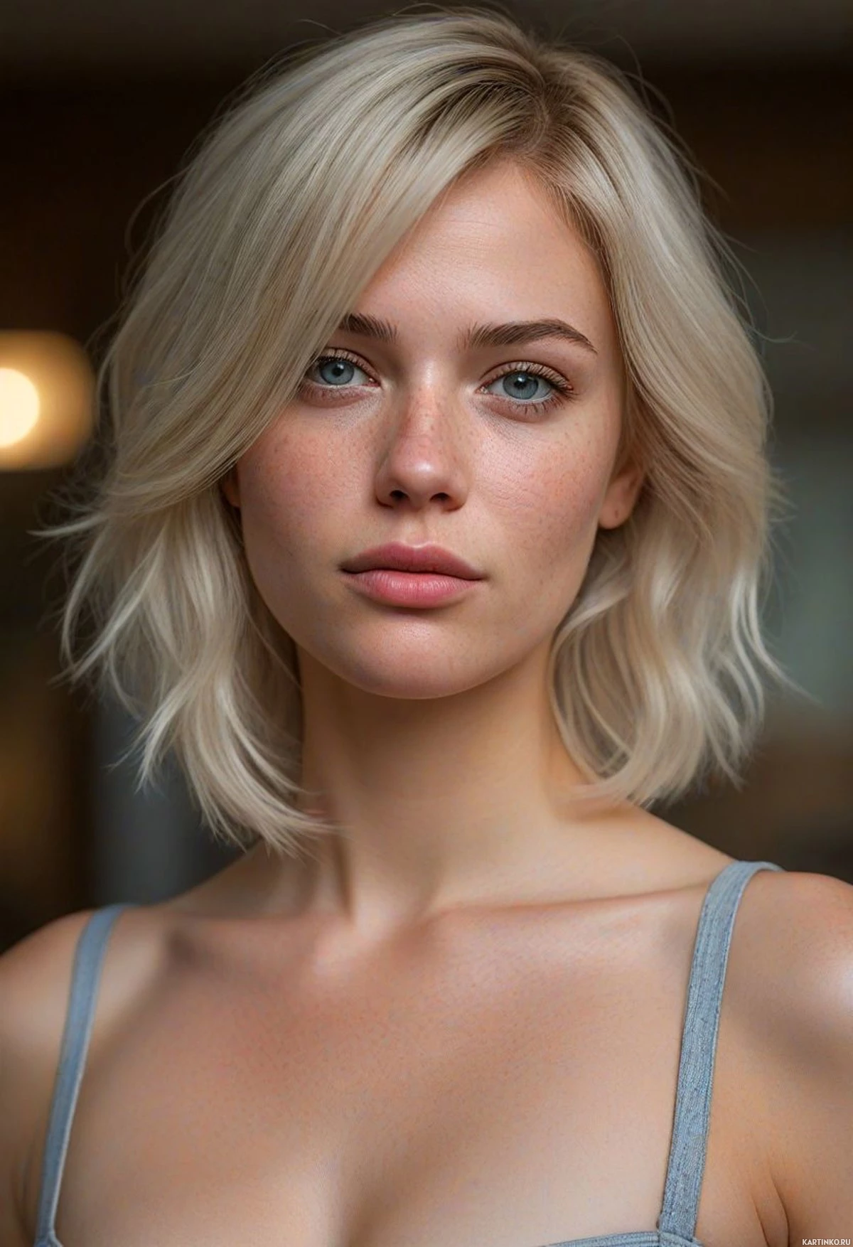На картинке молодая женщина с короткой стрижкой блонд. Её выражение лица нейтральное, взгляд направлен прямо в камеру. У неё светлая кожа, и на ней, кажется, лёгкий серый кроп-топ. Фон однотонный, не даёт никаких дополнительных сведений о месте, где сделан снимок.
