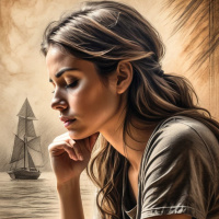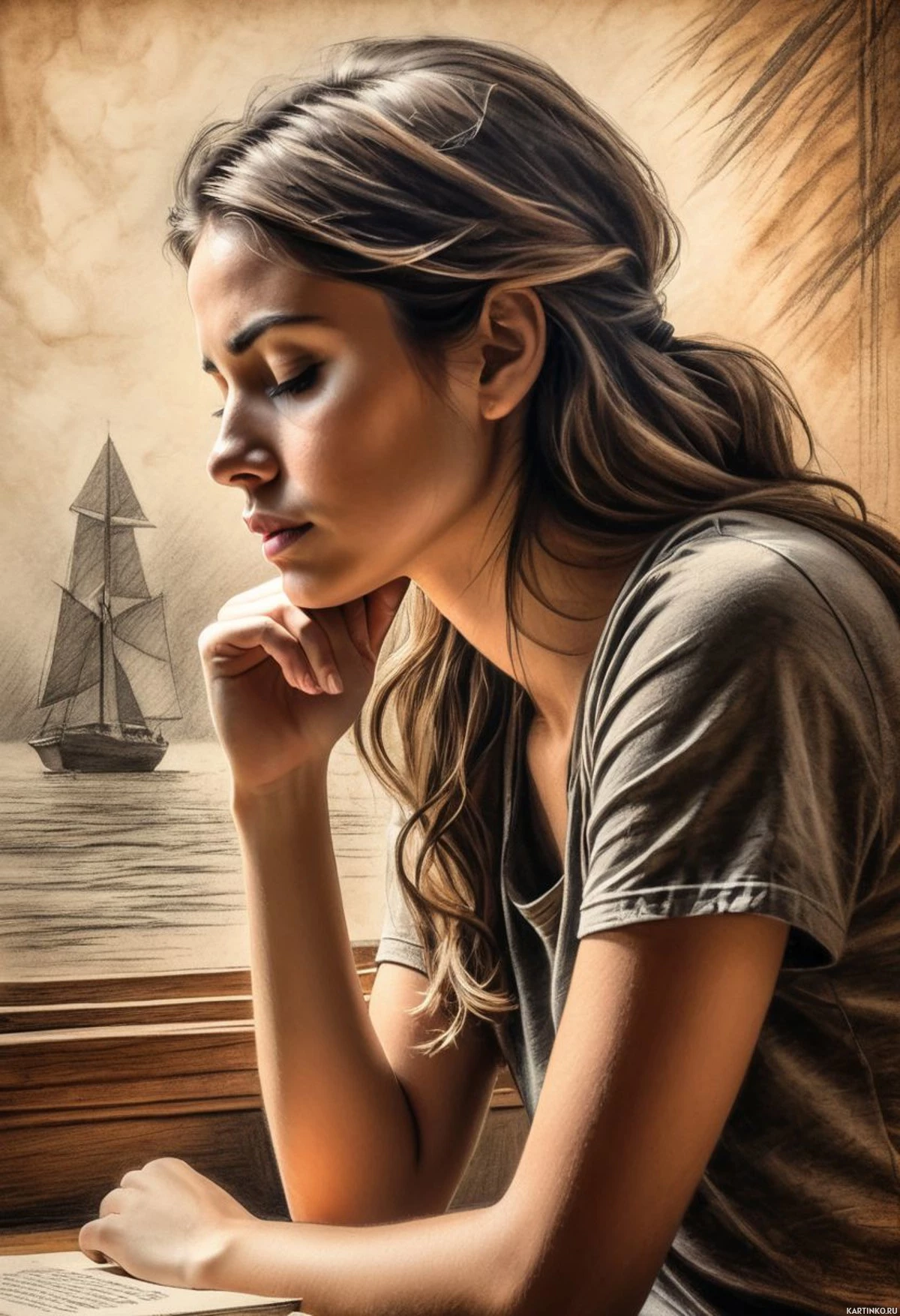 На картинке запечатлена женщина с закрытыми глазами, погруженная в задумчивости. Она сидит за столом, положив голову на руку, локоть опираясь на столешницу. На ней светлый оливкового цвета топ, который мягко выделяется на фоне. Кажется, это комната с окнами, из которых открывается спокойный вид на лодки, плывущие по воде. Цвета в картинке приглушены, создавая атмосферу тихой созерцательности.