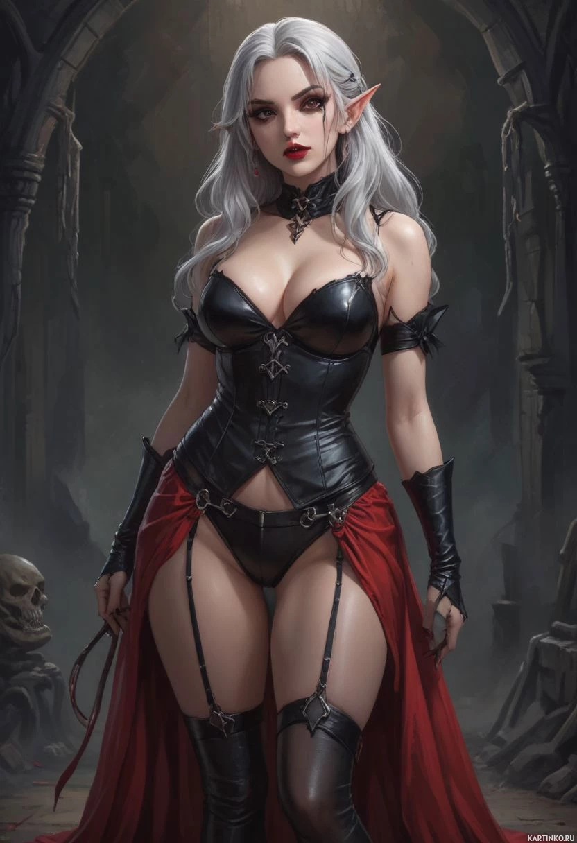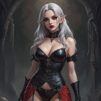The image depicts a character with elven features and white hair, standing in front of an ornate archway that resembles the entrance to a castle or underground cave. She is wearing black armor and has a cape or cloak draped over her shoulders. Her expression is neutral, and she appears to be looking directly at the viewer. The overall style suggests a fantasy or gothic influence in the artwork.