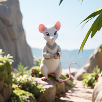 a fantasy setting. Two mice are at the forefront; one is walking upright on its