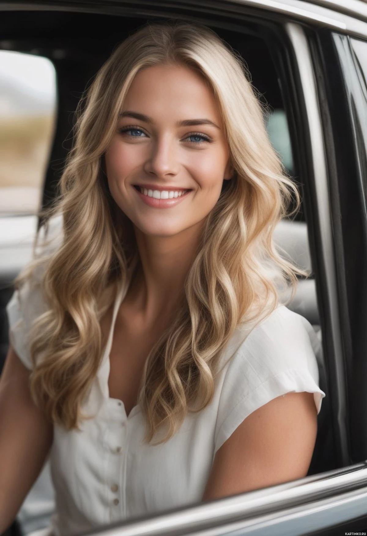 На картинке – молодая женщина с длинными светлыми волосами. На её лице – радостная улыбка, она смотрит в камеру. Женщина сидит в салоне автомобиля, похожего на внедорожник или кроссовер. На переднем плане виден интерьер машины, но акцент остаётся на лице и верхней части тела девушки, которая слегка повернулась в сторону окна, будто разглядывая окрестности. На ней светлая рубашка с пуговицами. Общее настроение картинки – светлое, а действие происходит днём.