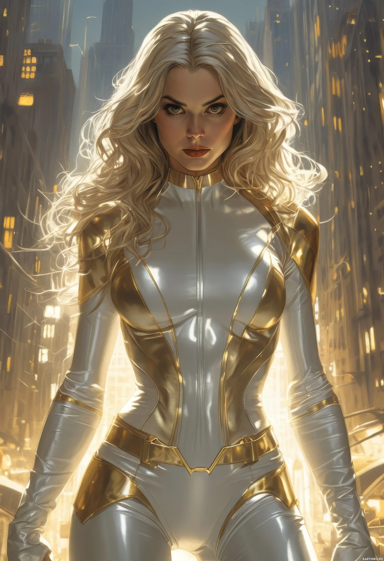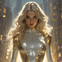 На картинке запечатлена женщина, стоящая с заложенными руками. У нее длинные светлые волосы, и она одета в облегающий металлический костюм с золотыми деталями и высоким воротником. Костюм имеет бронированные элементы на плечах и груди, а также ботинки, являющиеся частью его дизайна. Фон указывает на ночной городской пейзаж, где огни освещают улицу и здания позади нее. Стиль картинки напоминает рекламное или концептуальное искусство, возможно, связанное с комиксами или видеоиграми, судя по дизайну костюма и обстановке.