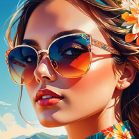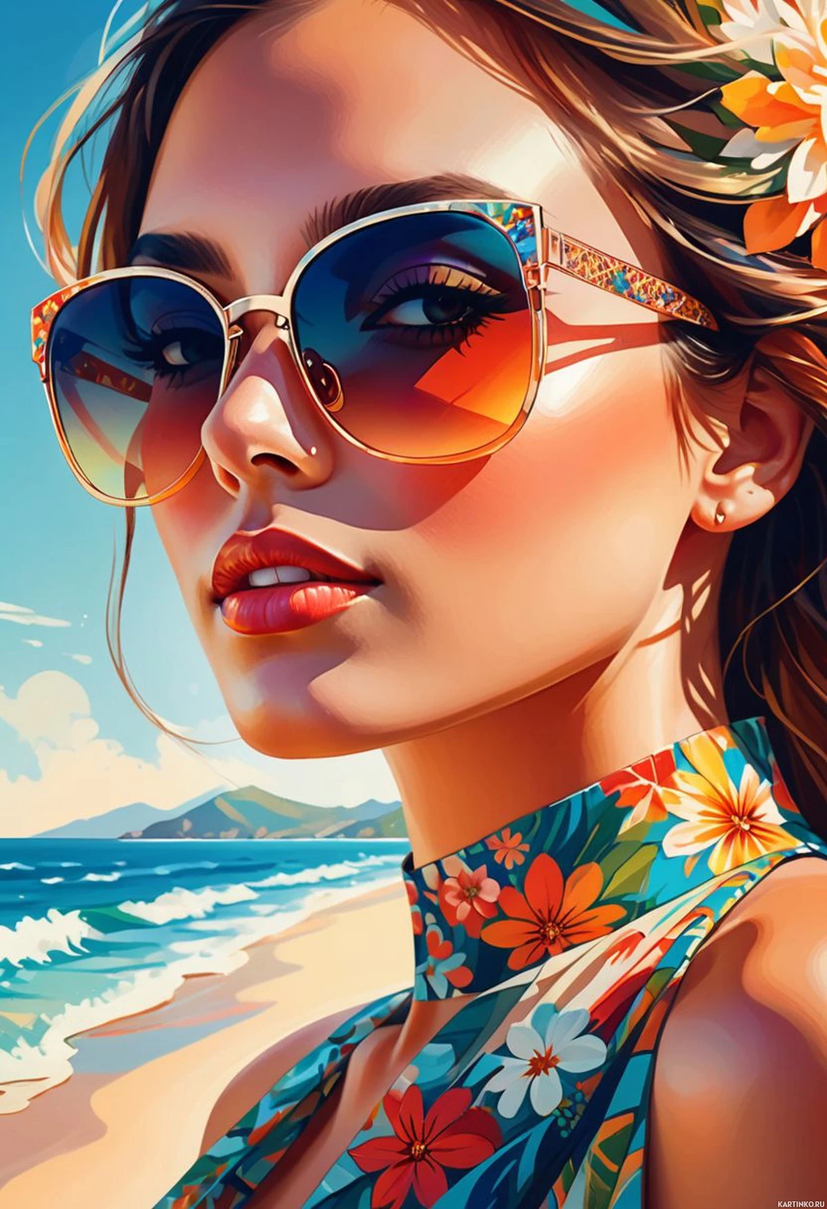 На картинке запечатлена молодая женщина, позирующая на песчаном пляже с чистейшей голубой водой на заднем плане. На голове у нее солнцезащитные очки, а на ней яркий топ без рукавов с цветочным принтом и цветочный венок. Макияж включает четко очерченные брови, тени и помаду. Освещение говорит о дневном времени, возможно, ранним утром или поздним вечером, судя по мягким теням.