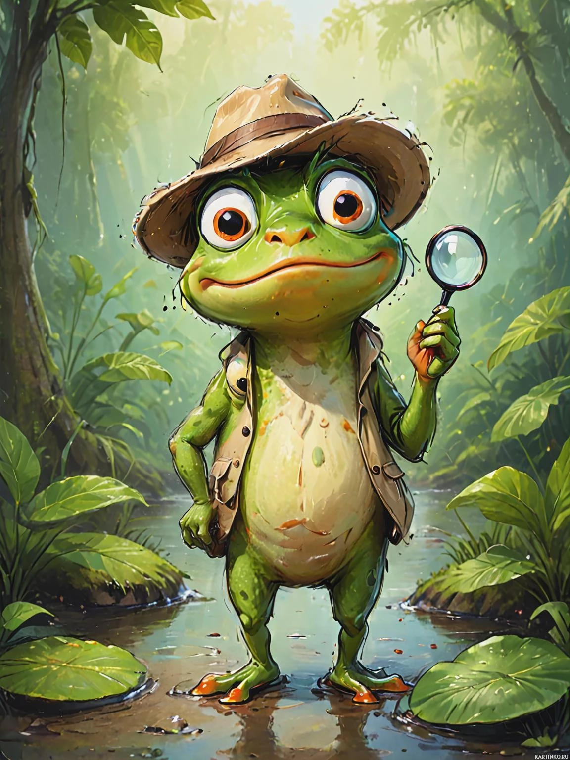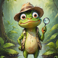a frog character dressed in a detective's outfit. The frog is wearing a large, round, wide-