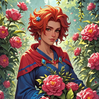 На картинке изображена женщина с рыжими волосами, собранными в пучок, в одеянии с золотой отделкой. На её лице – суровое выражение, взгляд направлен немного в сторону. В правой руке она держит букет роз, преимущественно фиолетовых, с добавлением белых и жёлтых оттенков. За спиной у неё – куст роз с зелёной листвой и розовыми цветами. На заднем плане – сказочный пейзаж с аркой, сплетённой из ветвей, и окружающими её деревьями. Стиль рисунка – иллюстративный, характерный для фэнтезийных жанров.
